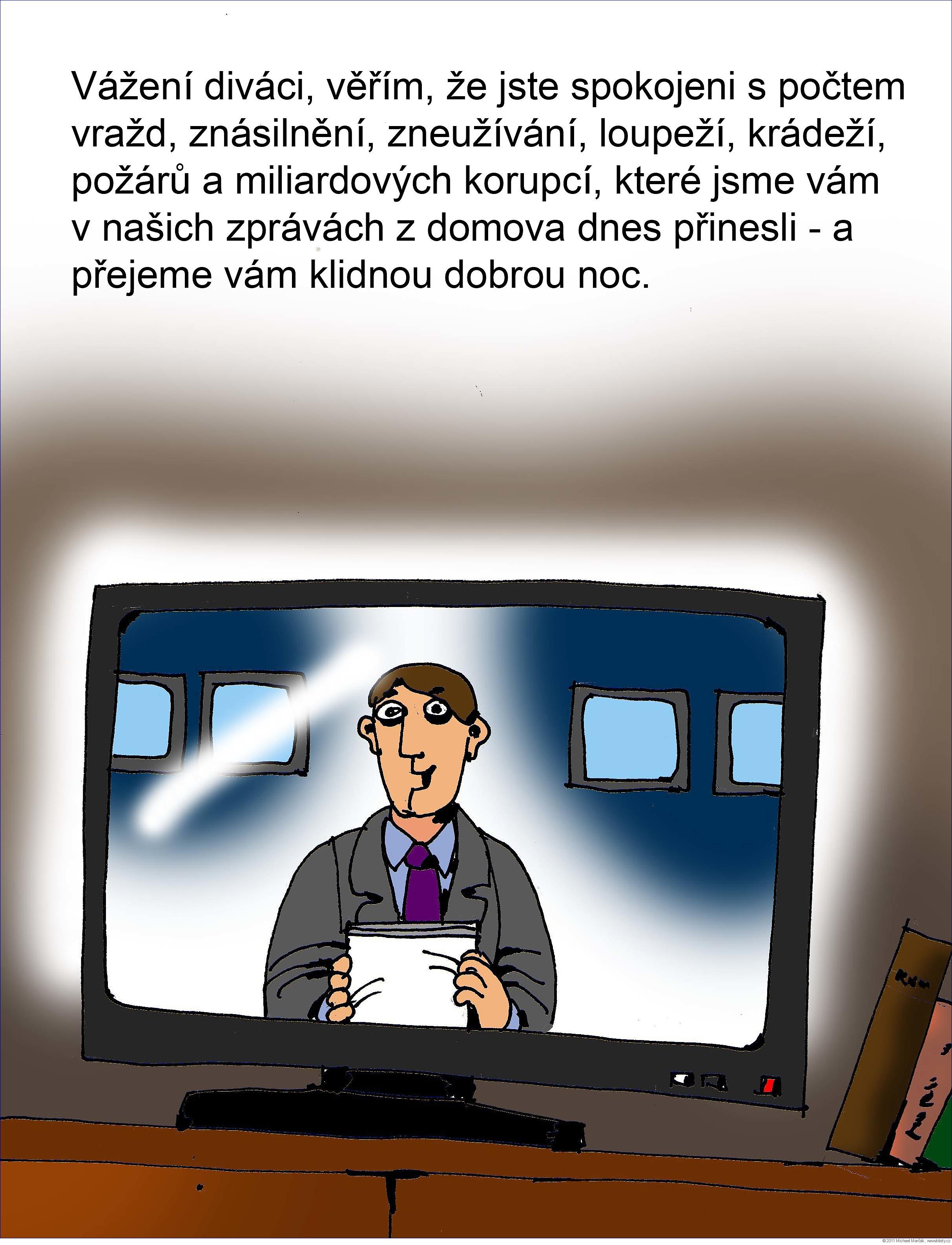 Trvalo mně velmi dlouho, než jsem pochopil, o co jde v českých televizních zprávách, co je jejich skutečným účelem. Bylo to z části díky mé vrozené duševní nedostatečnosti, a z části také díky mozkové příhodě, kterou jsem přechodil. Posledních 20 před odchodem do důchodu jsem nijak nemarodil, a díky pracovnímu nasazení jsem tu příhodu neléčil.
