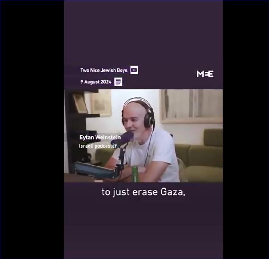 „Kdybyste mi dali tlačítko, kterým bych vymazal Gazu, aby zítra už nežila žádná živá bytost v Gaze, zmáčkl bych ho během vteřiny.“ Na sociálních sítích se šíří klip z izraelského anglického podcastu Two Nice Jewish Boys (Dva hodní židovští chlapci), v němž moderátoři Naor Meningher a Eytan Weinstein diskutují o možnosti vyhladit všechny jednotlivé lidi v Gaze, pokud by k tomu měli příležitost. Weinstein prohlásil, že kdyby existovalo tlačítko, které by „vymazalo všechny živé bytosti v Gaze“, „zmáčkl by ho ve vteřině“, a dodal, že věří, že většina Izraelců by udělala totéž.