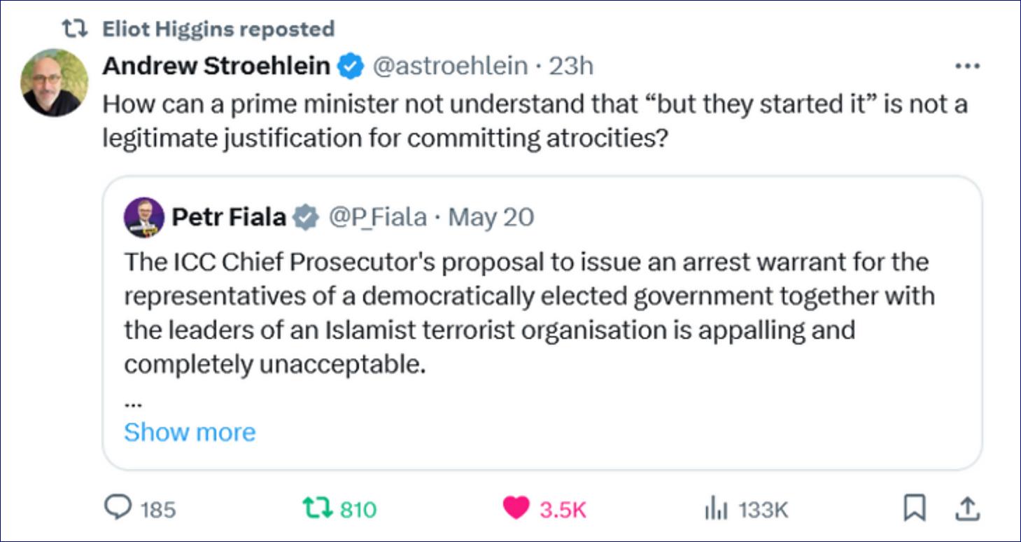 Obrázek: Jak může pan premiér nechápat, že "ale oni si začali" není legitimní ospravedlnění pro páchání zvěrstev? Andrew Stroehlein, Human Rights Watch