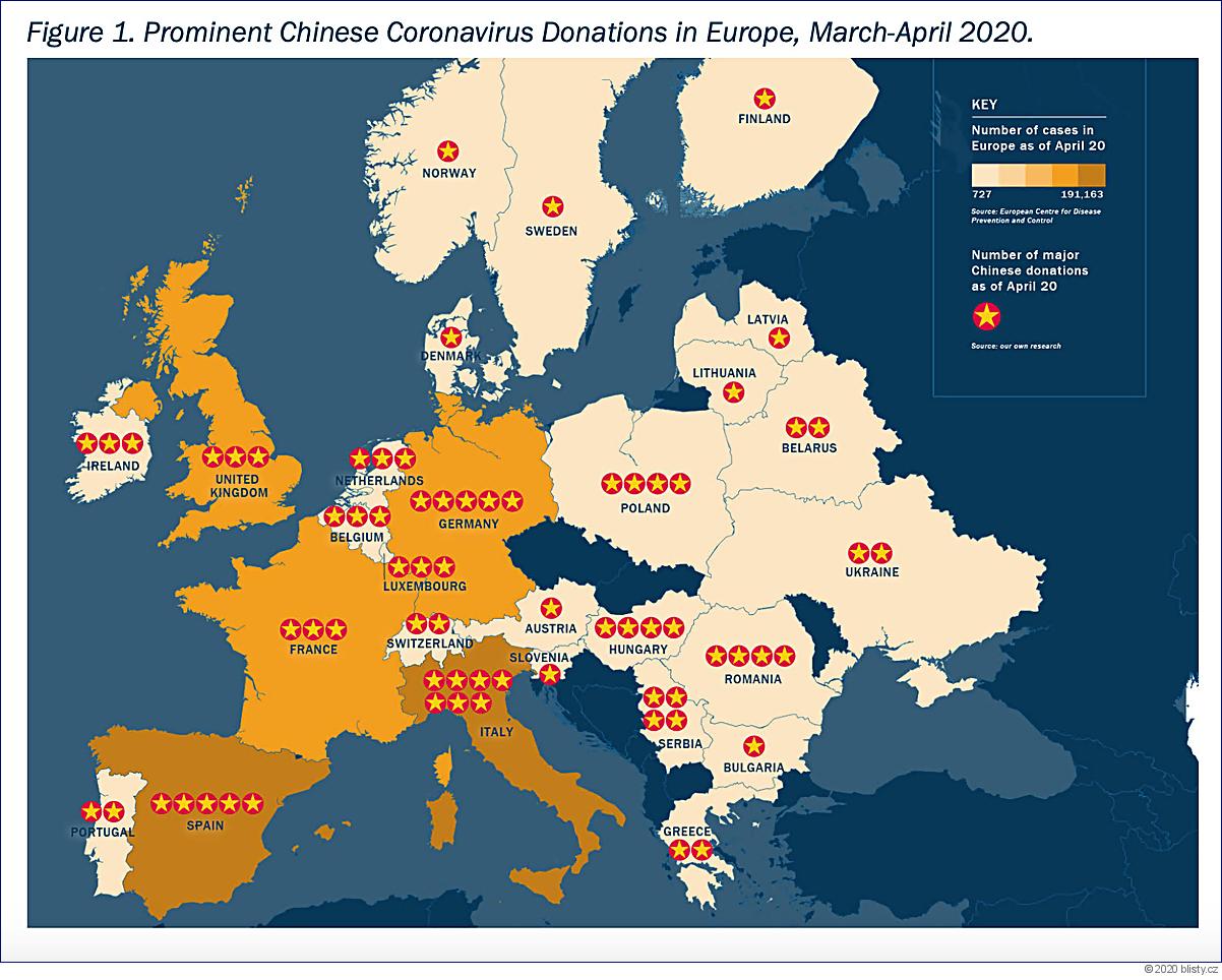 Analýza - Demaskováno: Pomoc Číny Evropě během koronavirové krize (Masks Off: Chinese Coronavirus Assistance in Europe), kterou vypracovala Alliance for Securing Democracy and Asia Program za podpory German Marshall Fund, ukazuje na datech dostupných z veřejných zdrojů, kterým zemím Čína darovala během března dubna 2020 zdravotnickou pomoc ve formě ochranných potřeb nebo přímé zdravotnické asistence.