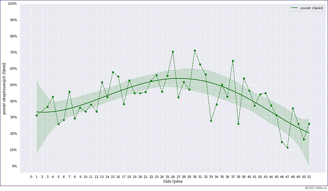 Jak můžete vidět na následujícím grafu, v průběhu jednotlivých týdnů poměr článků z celkového počtu publikovaných textů osciloval mezi několika procenty a až přes 70 %. V první třetině roku můžeme sledovat spíše stoupající tendenci vrcholící v období prázdnin, a naopak se konci roku můžeme vidět značný úpadek. Průměrně se podíl převzatých článků z webu Sputnik pohyboval mezi 40 a 50 % ze všech publikovaných článků. To je zjištění, na základě kterého můžeme konstatovat, že AC24.cz představuje jeden z amplifikátorů ruské propagandy v prostoru českého internetu.