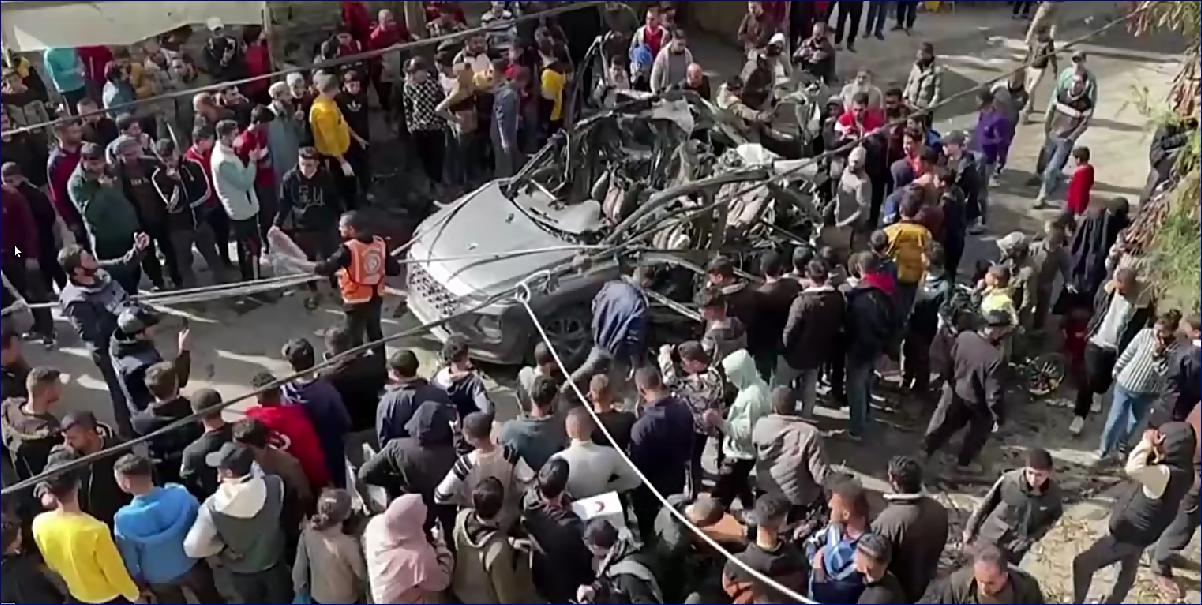 Reportérka: Mouka, rajčata, hovězí konzervy, základní zoufale potřebné vzácné zásoby vyletěly do povětří v autě, které Izrael zasáhl při útoku v Rafáhu. Lidé se shromažďují kolem. Tři mrtví a 15 zraněných.