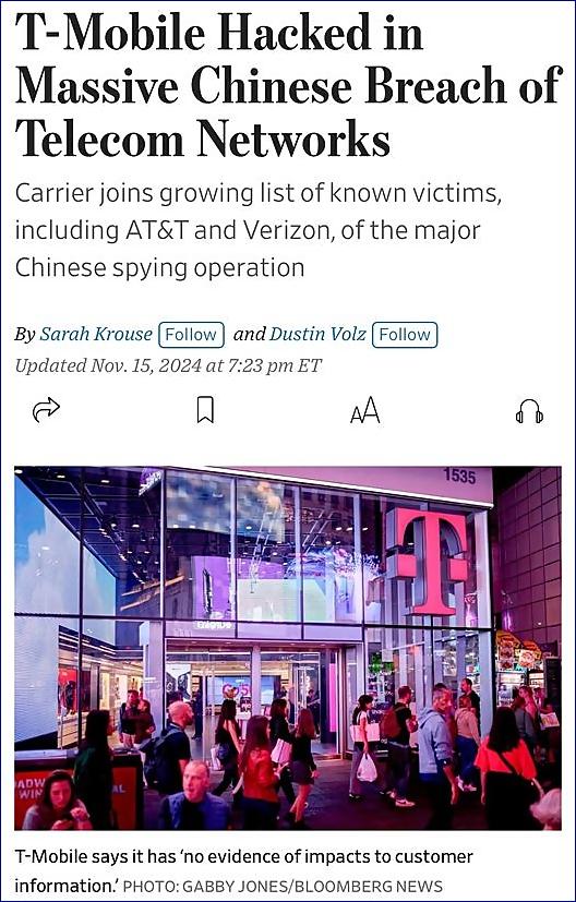 Kompromitace společnosti T-Mobile rozšiřuje seznam známých obětí kyberšpionážní kampaně čínských hackerů - přezdívané Solný tajfun -, kterou někteří američtí představitelé považují za historickou a svým rozsahem a závažností za katastrofální. Deník již dříve v říjnu informoval, že mezi telekomunikačními společnostmi, které utrpěly průnik, jsou AT&T, Verizon a Lumen Technologies.