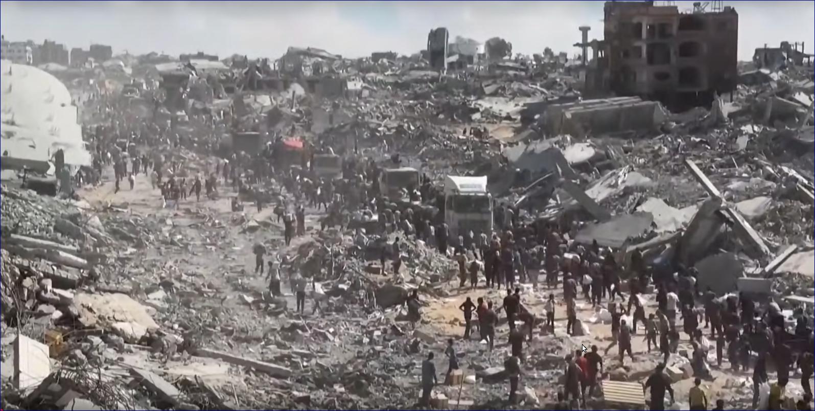 Vozidla jsou obklopena davem lidí, kteří scénu natáčejí na své telefony, zatímco jiní drží palestinské vlajky.