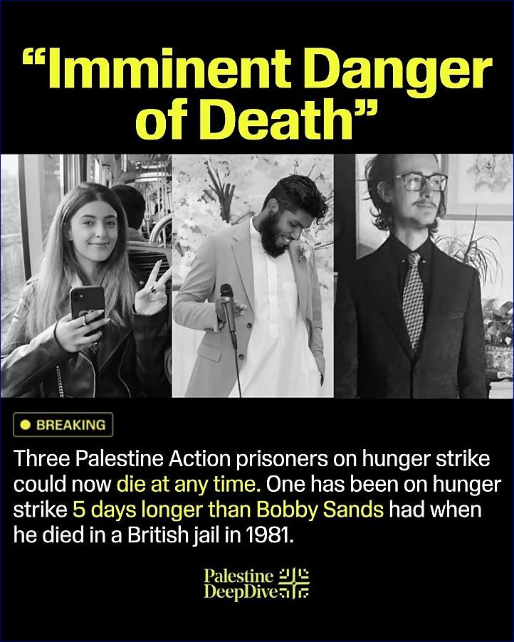 AKTUÁLNÍ ZPRÁVA: „Bezprostřední nebezpečí smrti“ Tři vězni z organizace Palestine Action – Heba Muraisi, Kamran Ahmed a Lewie Chiaramello – čelí reálné možnosti smrti, protože pokračují v hladovce na protest proti svému uvěznění. Heba dosáhla 11. ledna 70 dní bez jídla, Kamran 63 dní a Lewie 49 dní. Čtvrtý vězeň, Umer Khalid, také 11. ledna oznámil, že znovu zahájil hladovku. Muraisi podle svých příznivců nyní má potíže s dýcháním a trpí nekontrolovatelnými svalovými křečemi – což jsou možné příznaky neurologického poškození. Patří k skupině Filton 24, která čeká na soud za údajné trestné poškození výroby zbraní v izraelské zbrojovce Elbit poblíž Bristolu.