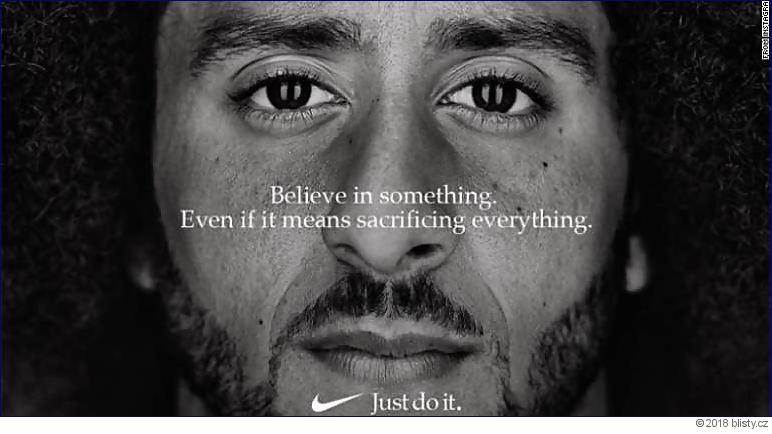 "Věř v něco. I když to znamená obětovat všechno." Firma Niké využila tichého boje Colina Kaepernicka, hráče amerického fotbalu, který svým gestem (pokleknutím během americké hymny) dával najevo svou podporu hnutí Black Lives Matter, které bojuje s rasovou nerovností v USA. Colin Kaepernick je v tomto smyslu považován za hrdinu, jenž oběštoval svou kariéru, jelikož s ním současní majitelé americké MFL nechtějí uzavřít profesionální smlouvu.